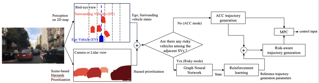 Abstract: Modern intelligent vehicles struggle to balance dynamic safety with personalized ride quality. Traditional rule-based systems often fail to navigate complex hazards or adapt to diverse human preferences. First, I propose a Risk-Aware Adaptive Cruise Control (ACC). This system uses Graph Neural Networks (GNN) to encode surrounding vehicle states, allowing an RL agent to predict safety parameters for a Hazard-Prioritized MPC. This integration enables seamless transitions between reference tracking and real-time risk mitigation. Next, I present a Personalized Ride Comfort Controller for EVs using torque-based pitch control. By employing Reinforcement Learning from Human Feedback (RLHF), the system learns reward functions from binary feedback to schedule control gains. This optimizes torque distribution to minimize discomfort according to individual preferences. These approaches demonstrate how data-driven learning augments classical control to achieve robust safety and human-centric mobility.