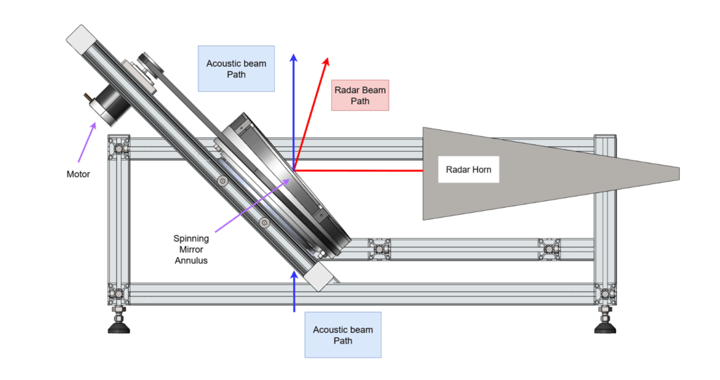 The widespread use of small, lightweight, autonomous airborne vehicles has heightened the need for accurate, real-time air turbulence analysis to mitigate their susceptibility to unpredictable atmospheric conditions. This research is on the development of a real-time, accurate and reliable Radar Acoustic Sounding System (RASS) to image air turbulence. The approach uses acoustic pulses and a coaxially aligned Doppler radar to image the acoustic pulses as they propagate through the air. Classically, Radar Acoustic Sounding is typically used in long-range meteorological studies to measure air temperature where the effects of turbulence constitute unwanted noise, this study inverts the problem in order to detect and characterise the intensity and direction of the turbulence as function of range using a conically scanned mirror which allows the acoustics to pass unimpeded while the co-located radar beam is scanned. To function as a RASS, the acoustic beam must remain centered on the origin of the radar beam. A conical scanning, adjustable-pitch mirror that allows for up to 20 degrees of squint angle of the radar beam over a 360 degree scan, while facilitating the unobstructed vertical projection of an acoustic beam through the middle of the mirror, has been designed and developed. Test measurements are ongoing to characterise the mirror transfer function and general radar performance. It is envisaged that the final system will operate at about 94GHz/212kHz and weigh only two hundred grams allowing it to be attached to a UAV.